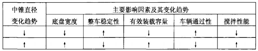 筒体两端锥体的锥顶角度一般都与其斜置角度相对应,相差无几,常控制在10°~20°之间,一般使前锥下母线、后锥上母线平行于汽车大梁,这样是为保持搅拌筒在斜置时顶部平直和一定的卸料性能,锥顶角及其主要影响因素的相互影响见表所示。也使整车更加协调、美观。