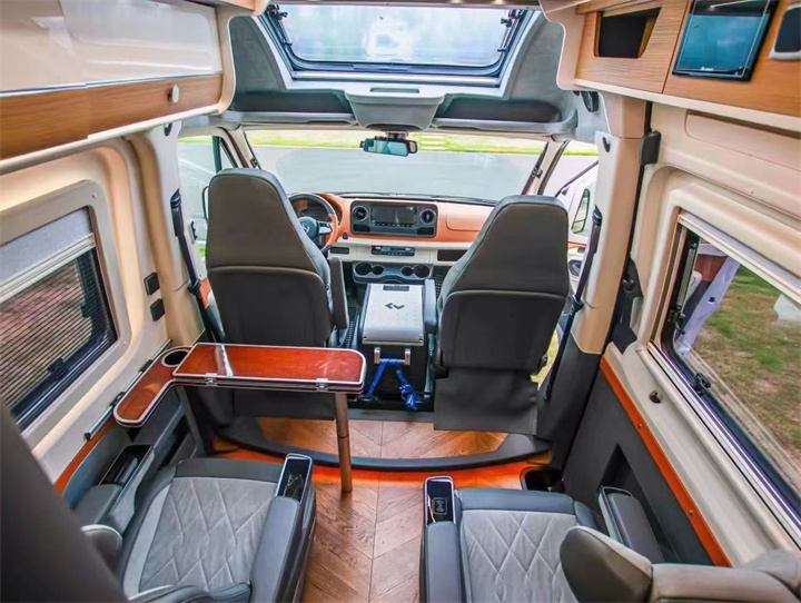 主副驾驶单人带扶手座椅以及座椅旋转通通都有,整体内饰的风格属于深色系的风格风格,搭配豪华拼接纹木地板,整车也都采用了豪华的真皮软包,所以质感很强,在b型的房车中,它绝对属于一个天花板级别的享受。核载人数为4人,适合1~4人正常的一个出行。中央两个是豪华的航空座椅,通风加热按摩腿托的所有功能全部都有具备,而且是电动可以调节,即使是长途旅行,它的乘坐感受也非常到位。对于睡觉的区域,后面有一个横置的双人床铺,中间部分是电动升降组合的,而且还有单独的床垫,睡1~2人还是能够睡得下的。