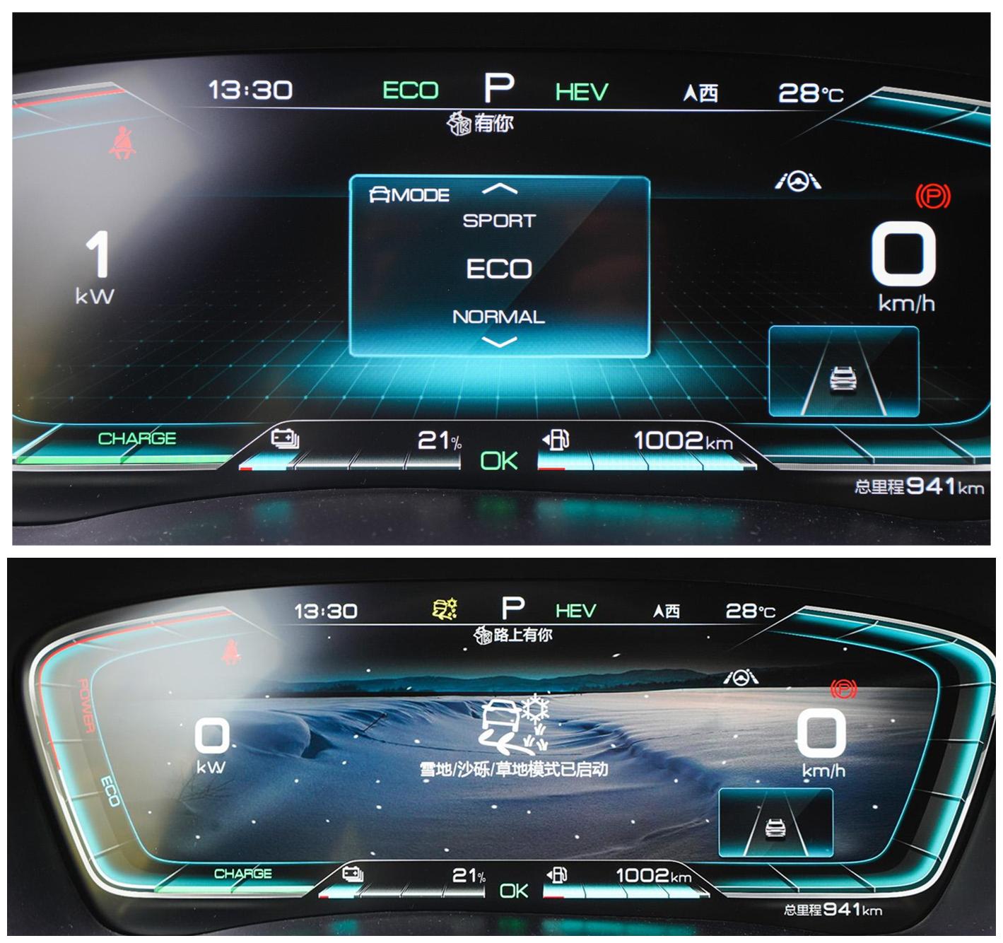 驾驶模式全系可选EV,HEV,ECO,SPORT和NORMAL五种模式,其中21款 100KM 四驱旗舰 PLUS和21款 100KM 四驱旗舰 PLUS 5G版还多了沙砾,草地和雪地模式。
