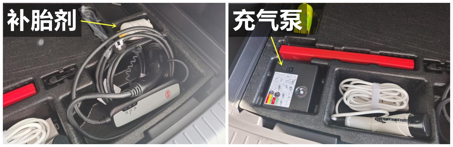 备胎,全系没有备胎,但在后备厢垫下面配备了补胎剂和充气泵。