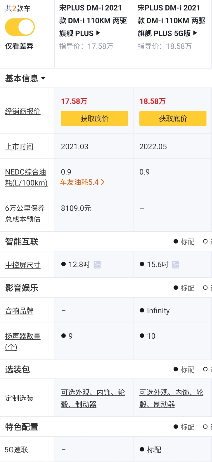 21款 110KM 两驱旗舰 PLUS 5G版对比21款 110KM 两驱旗舰 PLUS,价格+1万元,中控12.8英寸升级到15.6英寸,显示效果更好。DIRAC音响升级为Infinity音响,扬声器数量从9个增加到10个,并且车联网从4G升级为5G。个人觉得升级的配置主要是中控和音响,如果预算有限的话,可以不升级。