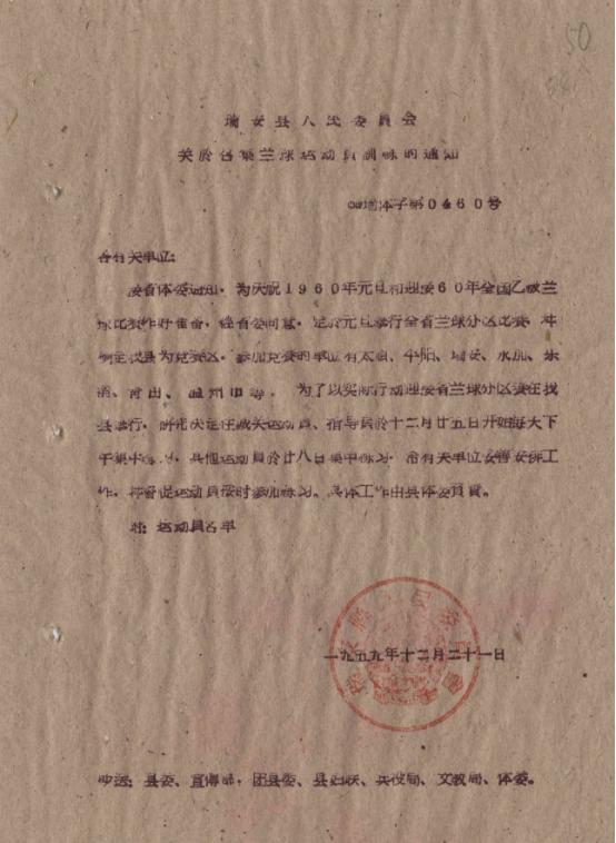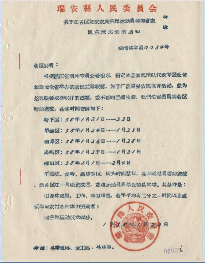 1958年1月,瑞安县委发特急件,要求在各区选拔农民篮球运动员,积极备战全省农民篮球联赛。1959年12月,瑞安县委又发文召集篮球运动员,训练备战全国乙级篮球赛。这些,应该就是点燃瑞安篮球梦想的星星之火。