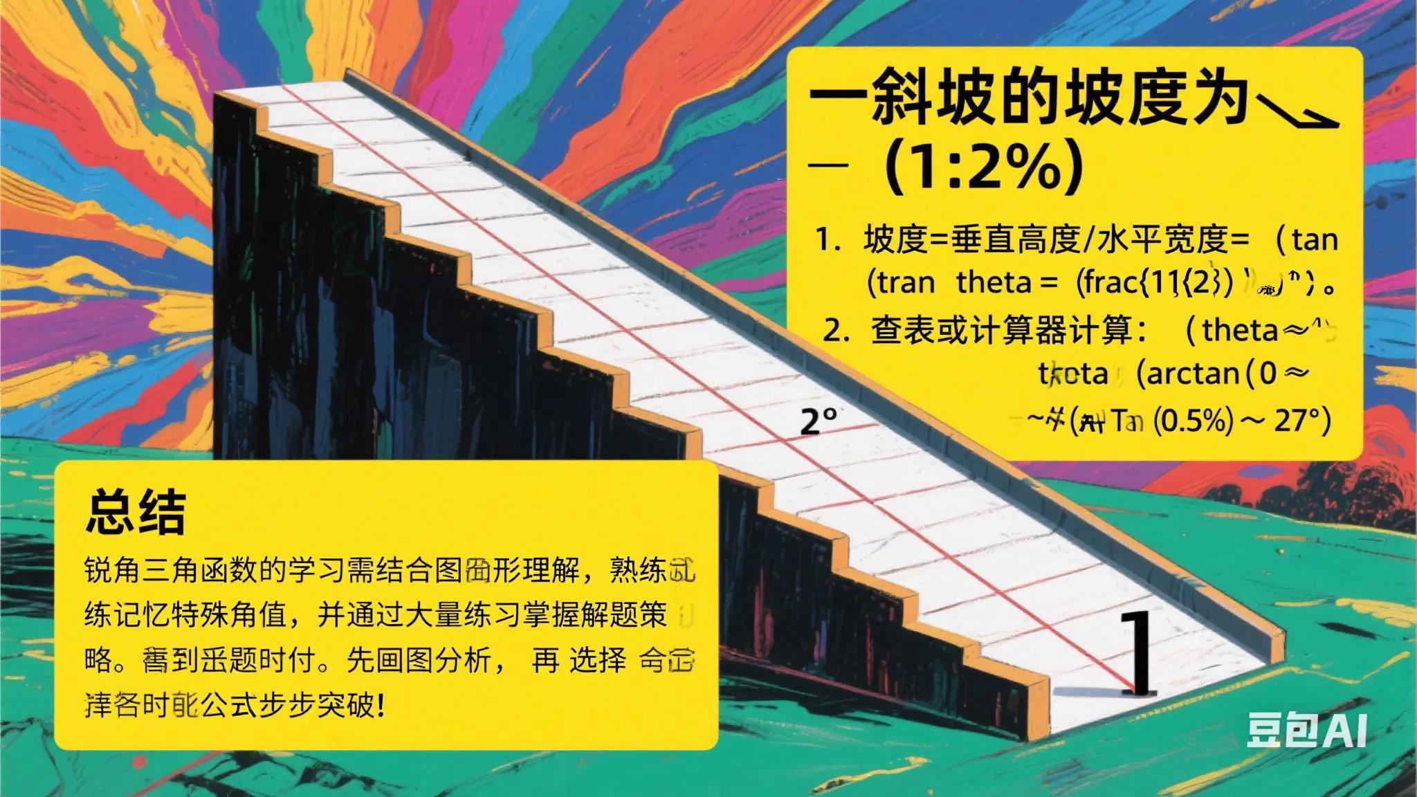 - 实际问题:测量高度(仰角、俯角)、坡度计算(坡度=\(\tan \theta\))等。