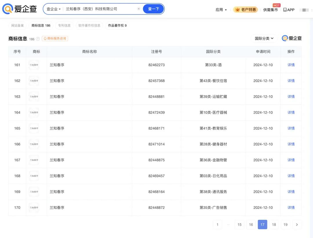 与此同时,与辉同行(北京)科技有限公司2025年4月将多枚“兰知春序”商标转让至兰知春序(西安)科技有限公司,上述商标申请于2024年12月,国际分类涉及健身器材、医疗器械、广告销售等,当前商标状态均为等待实质审查。