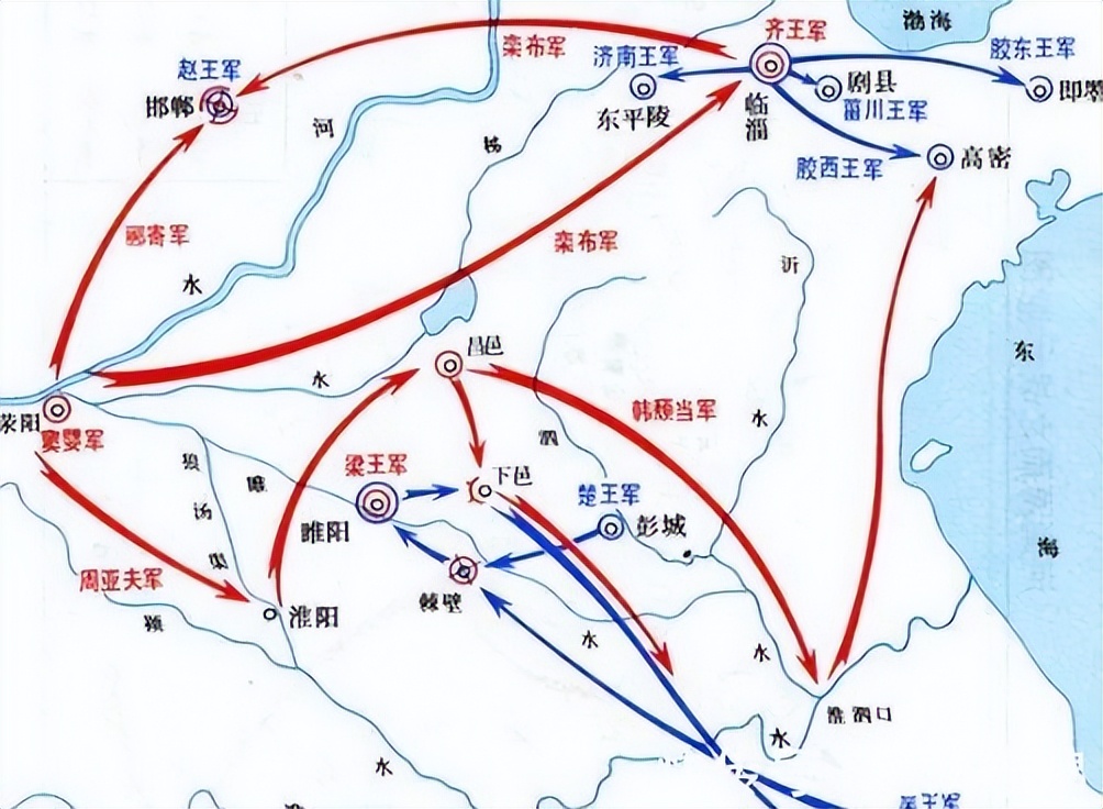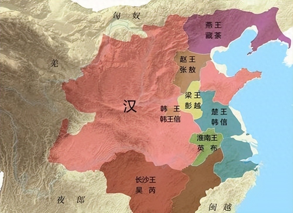 在楚汉战争中,刘邦为了打败项羽,为了拉拢和报答功臣集团,先后封了七个异姓王:淮南王英布、赵王张耳、燕王臧荼(后来卢绾接任)、齐王韩信(后来改为楚王)、梁王彭越,韩王信、长沙王吴芮。