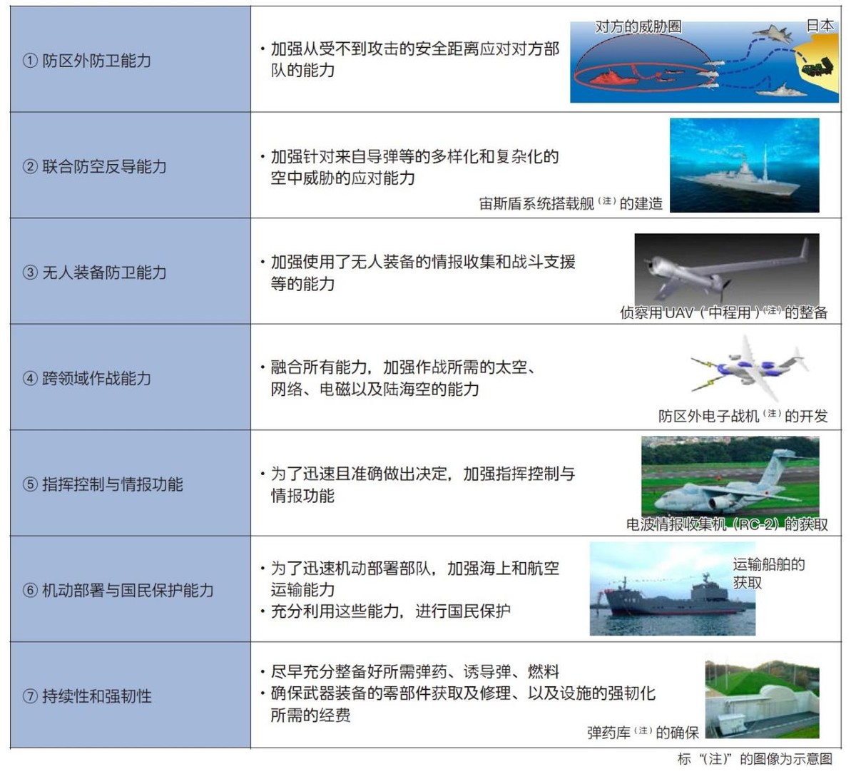 日本新年度国防建设主要提升7方面的能力:防区外防卫能力、联合防空反导能力、无人装备防卫能力、跨领域作战能力、指挥控制与情报功能、机动部署与国民保护能力、持续性和强韧性。