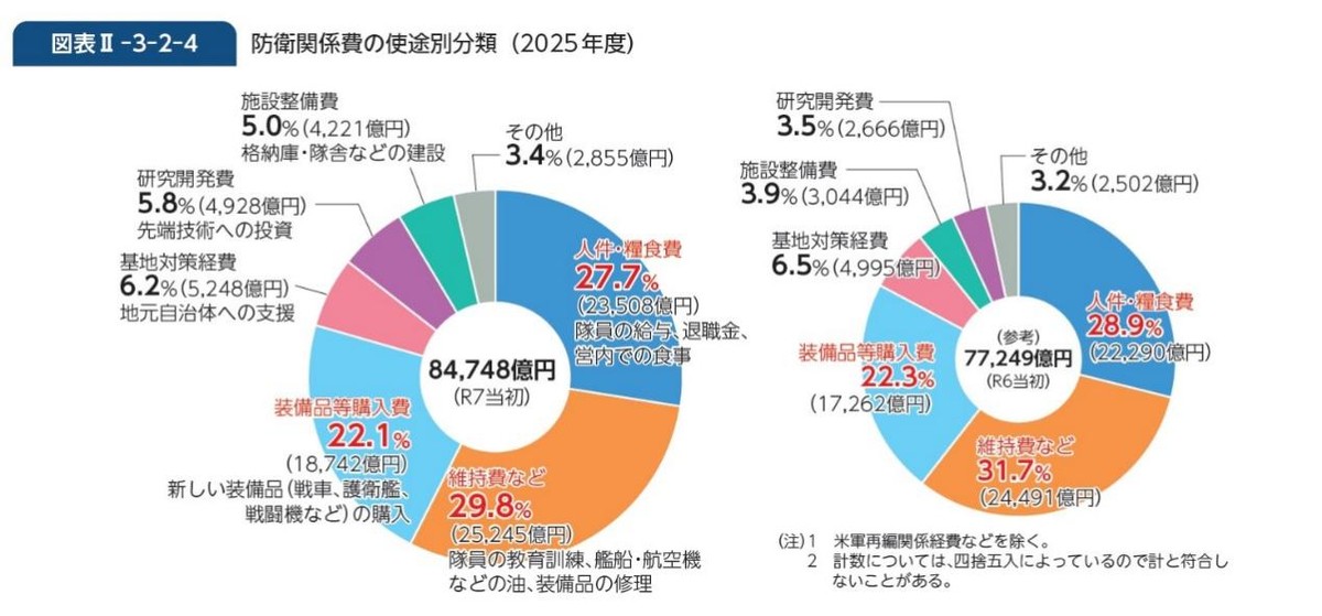 这与中、美、俄等军事大国的军费使用,大约三分之一人事费用、三分之一训练和维护费用、三分之一新装备研发和采购费用,基本相同。这说明日本在军事方面已经是个正常国家。