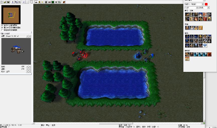 在这里,做出水面是在地形面板,放置树木是在地形装饰物面板,放置英雄和士兵是在单位面板。做什么地形,装饰物是没有限制的,只看你自己天马行空的想法。