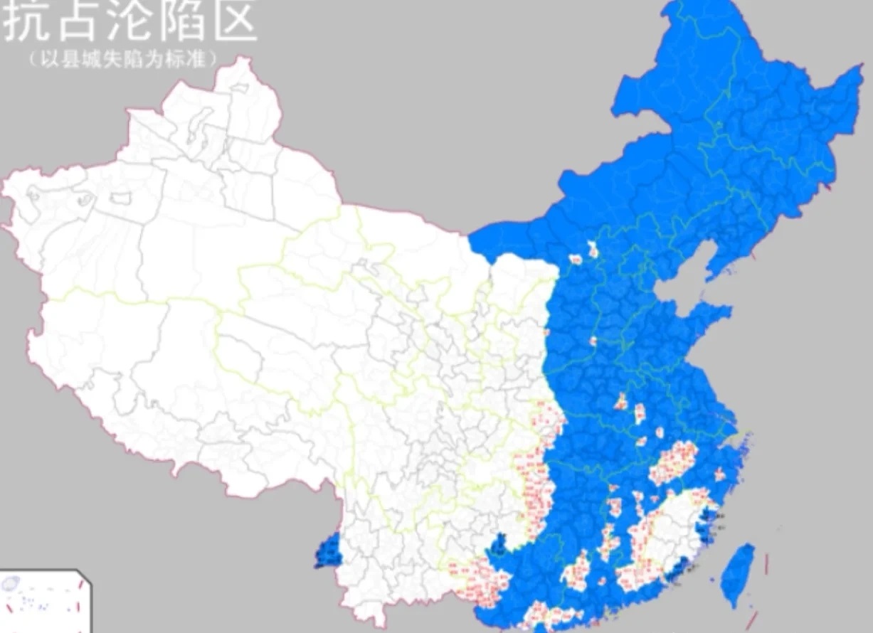这其中西藏、新疆、青海是由于距离战场太远,所以日本人一时打不到那里去。陕甘宁地区是当时重要的抗日根据地。四川则是战时陪都所在地。此外当时处于葡萄牙人实际管治下的澳门也成为了日本占领区内的一座孤岛。其他省份或多或少都曾有部分地区一度被日军占领过,但即使是这些被占领过的省份也从未放弃过与日寇的战斗。表面上看大半个中国当时都沦陷于日军铁蹄之下,但实际上日军并没能真正在这些地区建立起稳固的统治。