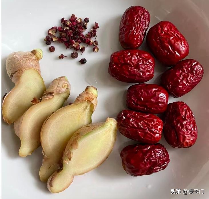 2、生姜洗净切片、红枣和花椒适量也清洗干净待用。红枣切开去核待用。