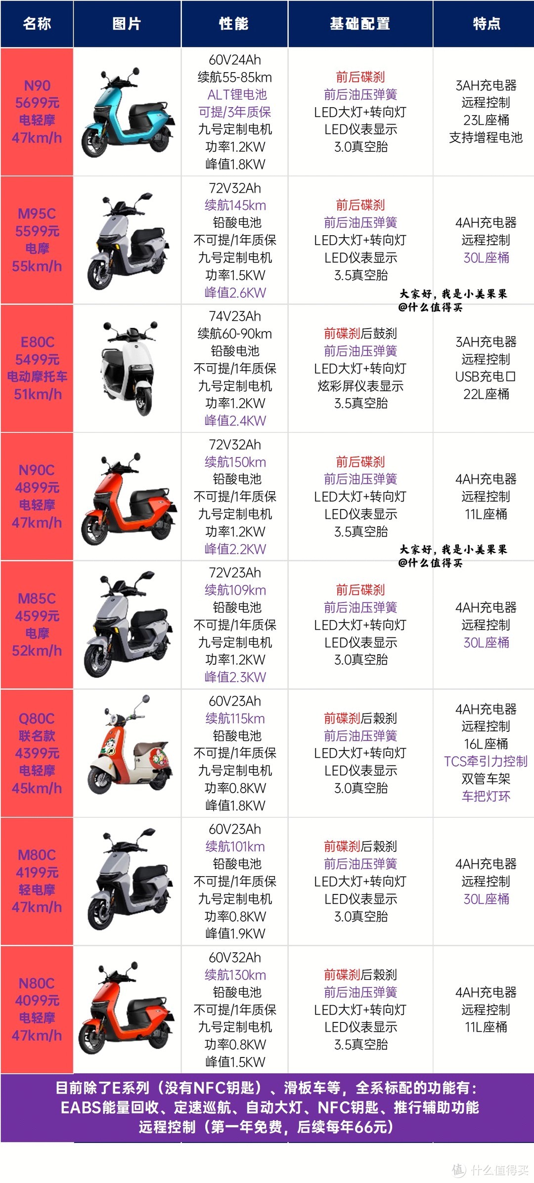 为了让大家大致了解九号的电动摩托车每个系列的大致定位,我总结了每个系列的大致特点(可能有微小差异),也让大家对每个系列的车型有一个大致印象: