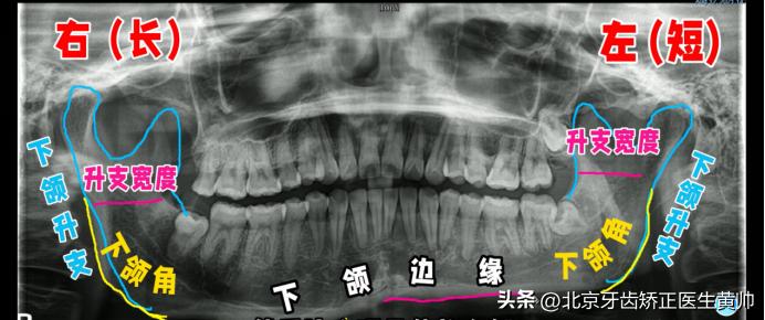 从片子上看下颌角双侧发育是不是对称的,以及下颌边缘是否在同一高度。
