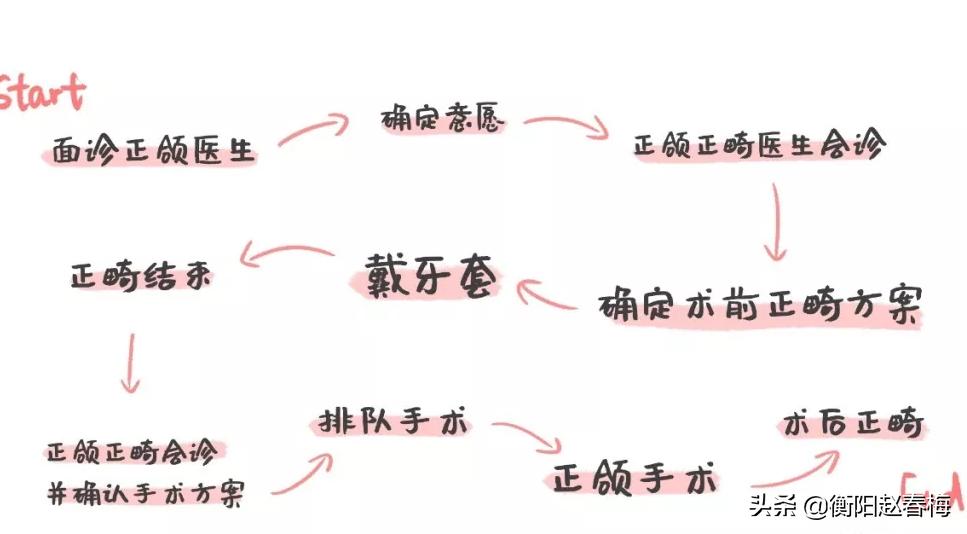 这里说一下大多数牙友的流程,第一步先去面诊正颌医生,医生会根据你的面型,牙齿模型,x光片判断你是否需要正颌,一般轻度的会被打回去正畸的哈,如果确定你是需要正颌的并且你有坚定的正颌意愿,接下来正颌与正畸医生会诊,确定术前正畸的方案并开始戴牙套,当你术前正畸治疗结束,达到手术要求后,正颌医生与正畸科医生再次会诊,同时进一步确认手术方案或进行适当修改,接下来就可以正式排队入院等待手术啦,一般正颌手术结束后5周左右可以开始术后正畸,术后正畸不要太晚不要拖哦。