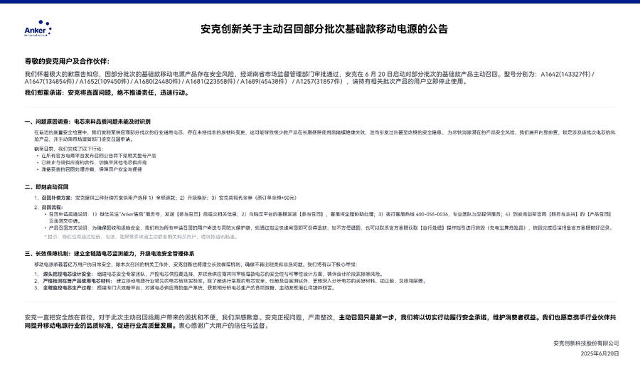 6月16日,深圳罗马仕科技有限公司因“电芯缺陷在极端场景下可能过热燃烧”,宣布召回3款型号的充电宝,共计49万台。仅4天后,安克创新(Anker)也宣布在中国市场召回71万件基础款移动电源,原因是“供应商电芯存在未经批准的原材料变更,可能导致隔膜绝缘失效,引发燃烧风险”。