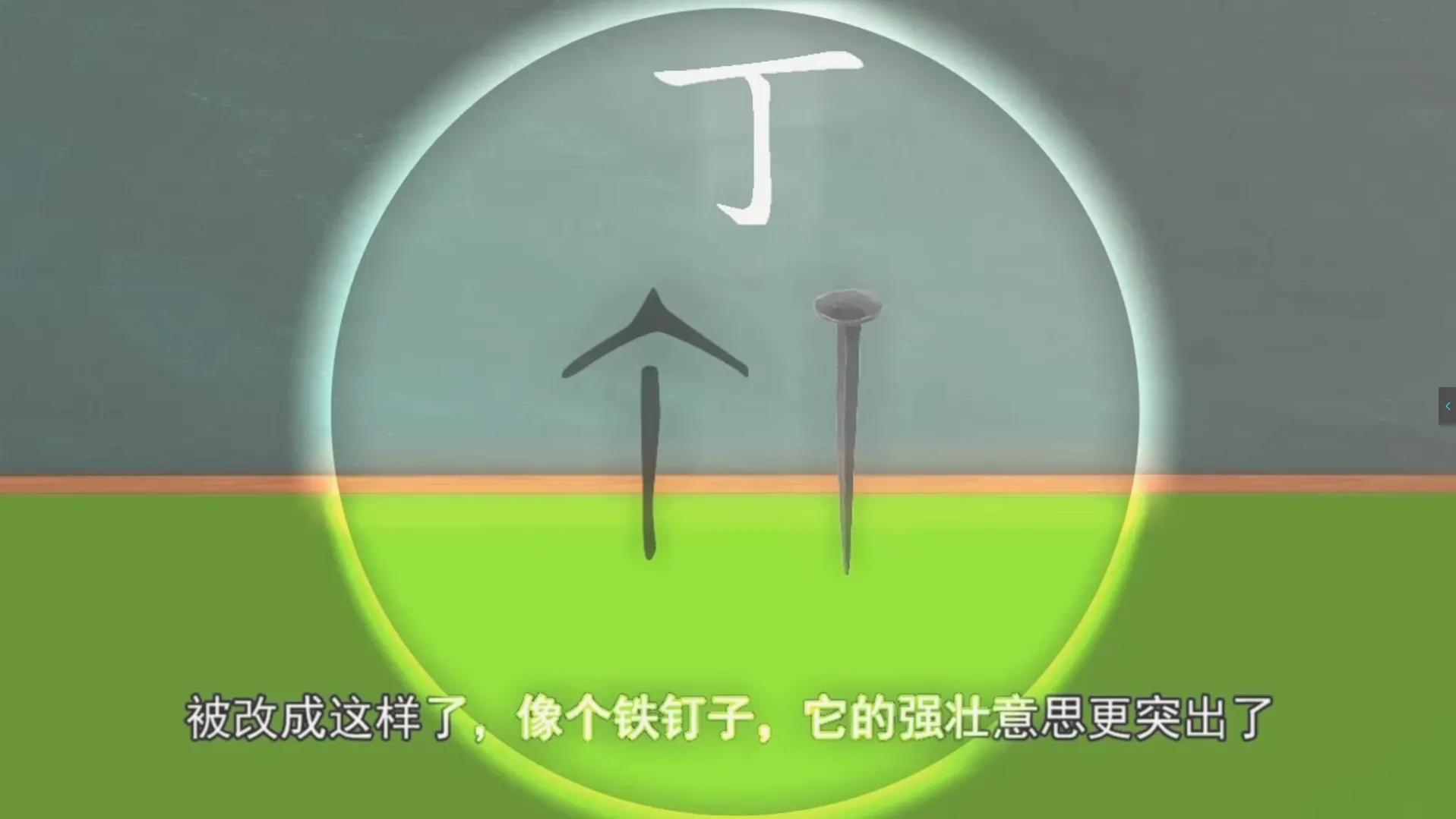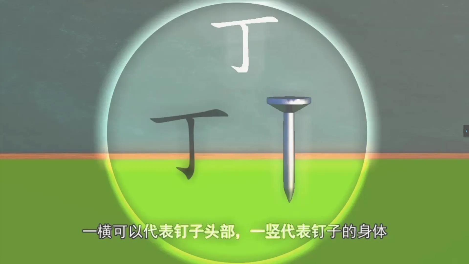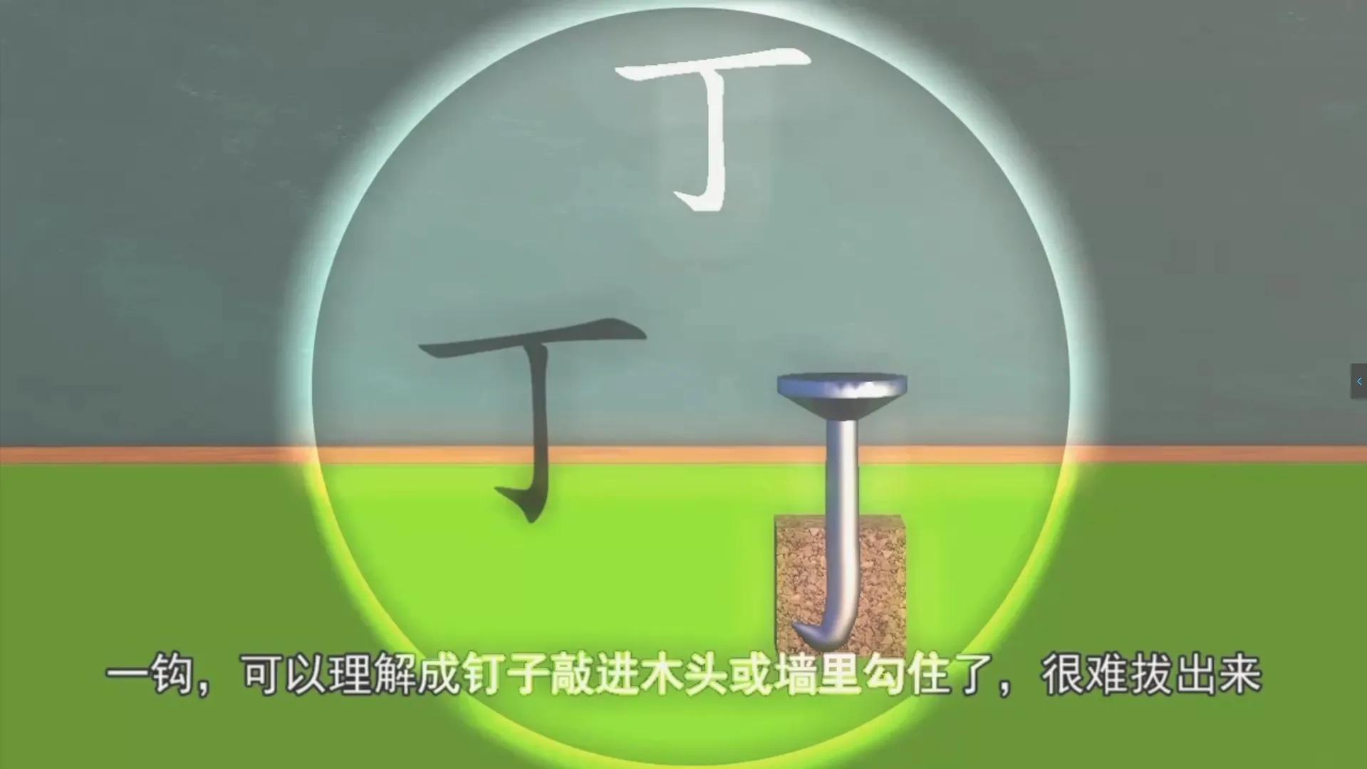 比如这个丁,一横可以代表铁钉的头部,一竖可以当作是钉子的身体,一钩可以想象成铁钉子钉入墙里变弯了。