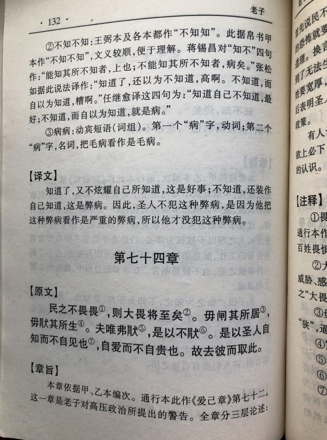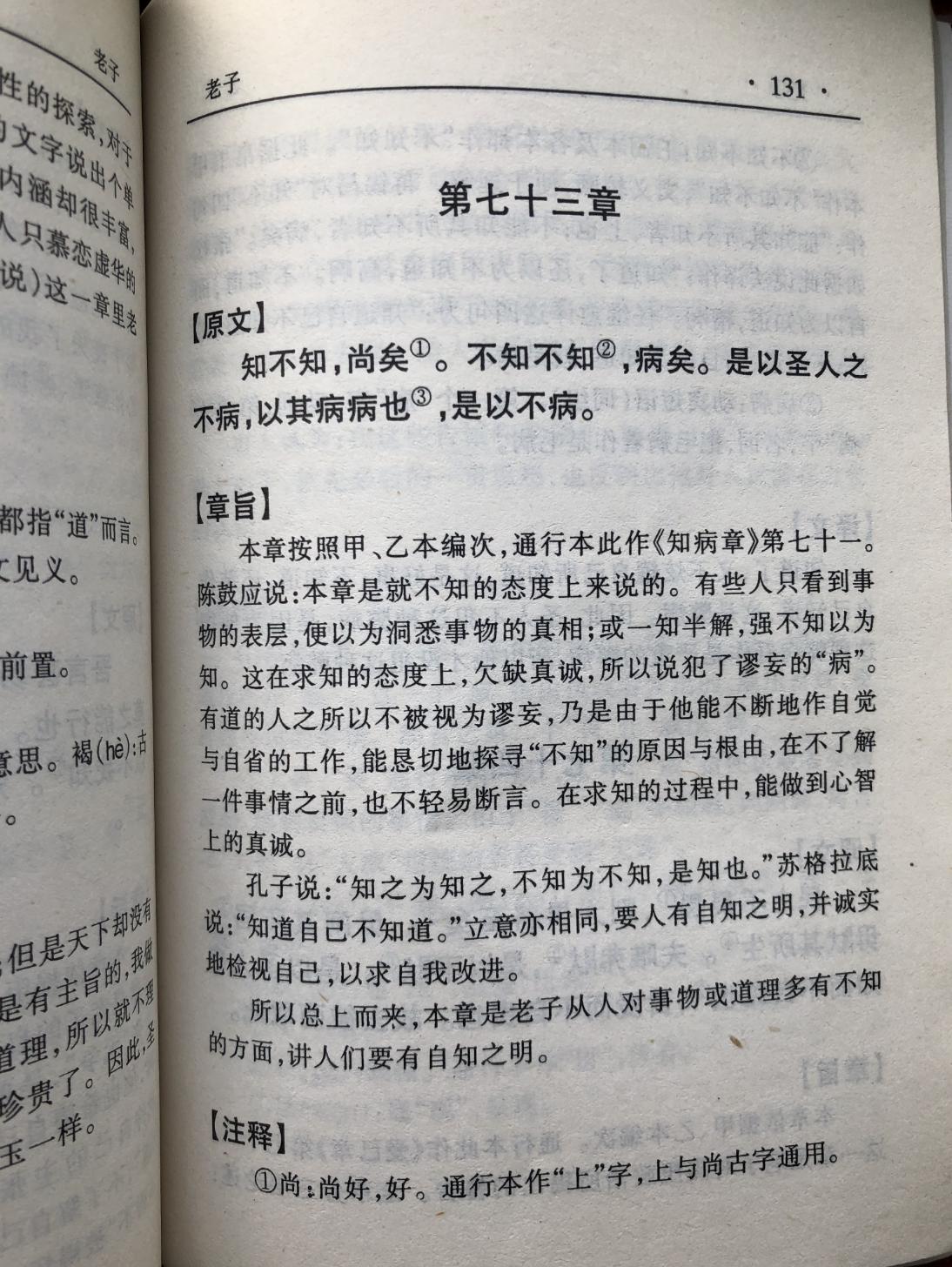 本章老子是告诫人们实事求是,知道就知道,不知道就不知道,不要为了彰显权威而固执己见。而有道的统治者却能够直视自己的不足,礼贤下士,虚怀若谷,不断完善自己。这样的统治者才会少犯错误。统治者如此,普通人也一样。保持实事求是,谦虚谨慎,不断自我提升,不断进步,这才是求道的精神。