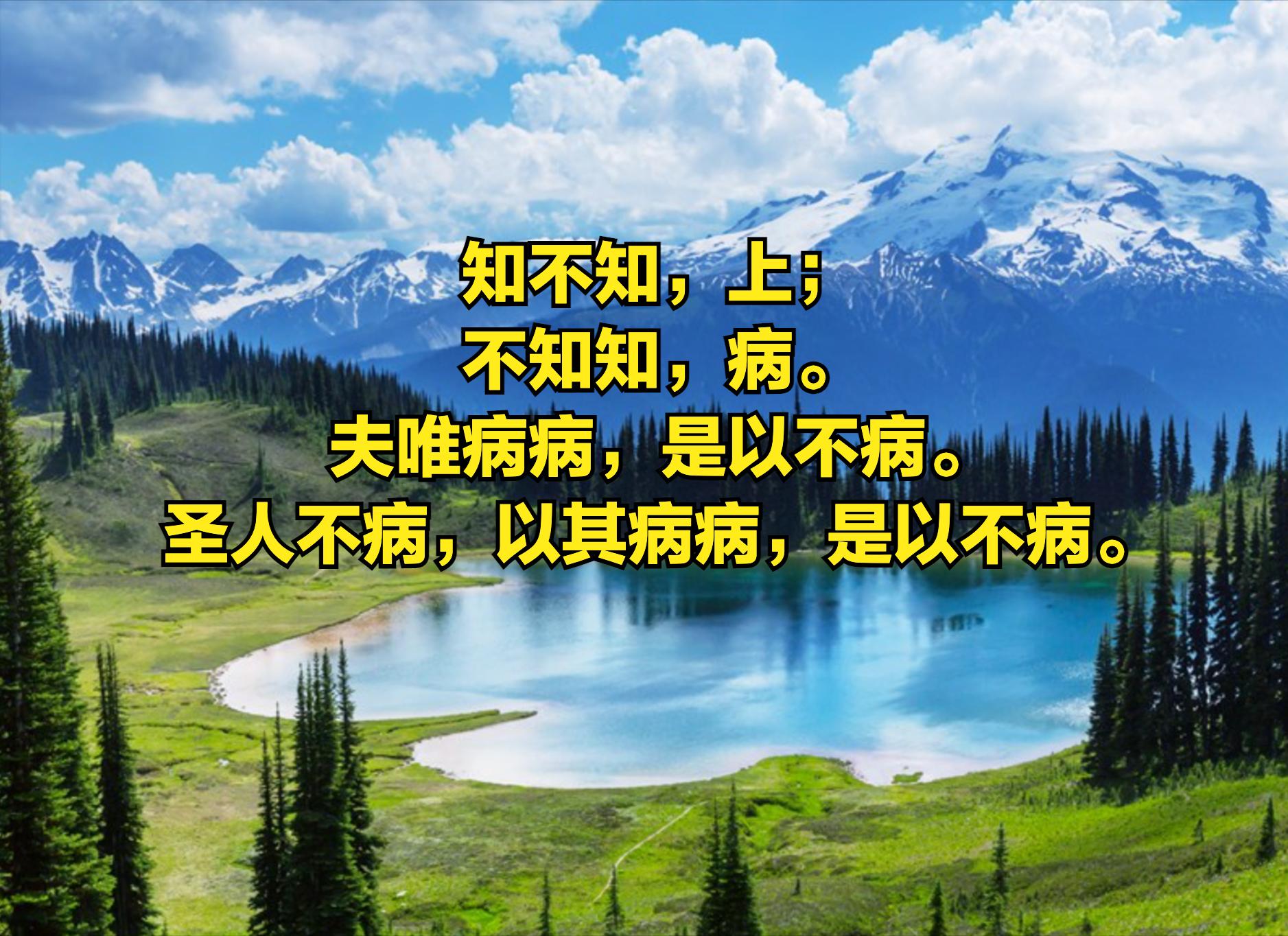 本章老子主要是谈悟道和没有悟道的区别,把人性的弱点指了出来。很多人没有入道或者稍微入道就不懂装懂,自以为是,夸夸其谈,老子认为这是一种病态。而真正入道的人,知道自己还有不足,始终保持着求知的精神。即便他已经知道了,也会保持虚怀若谷,谦卑低下,不会刻意表现出已经知道了。
