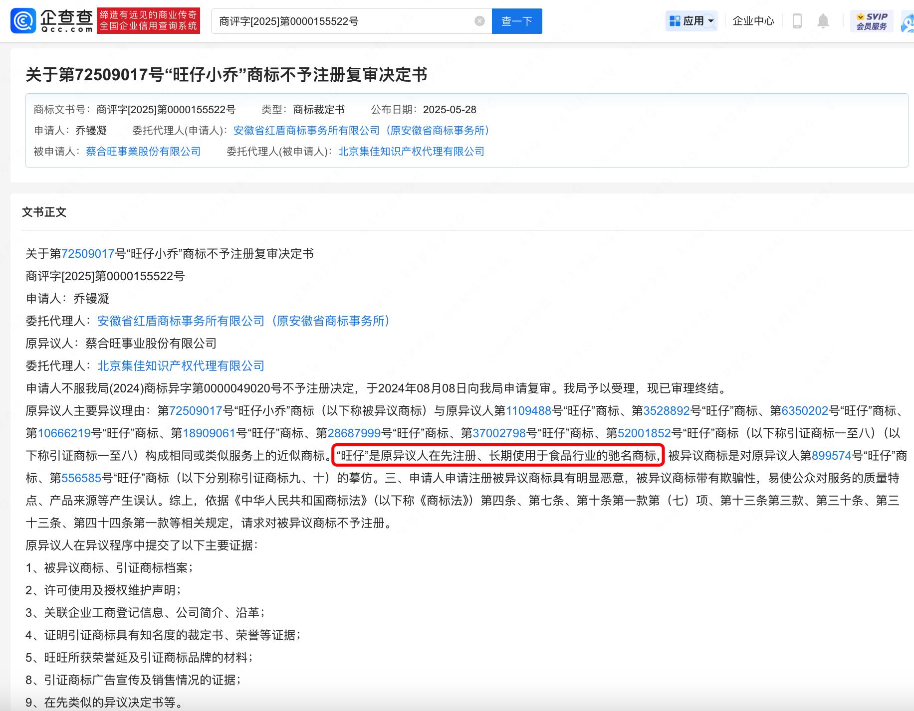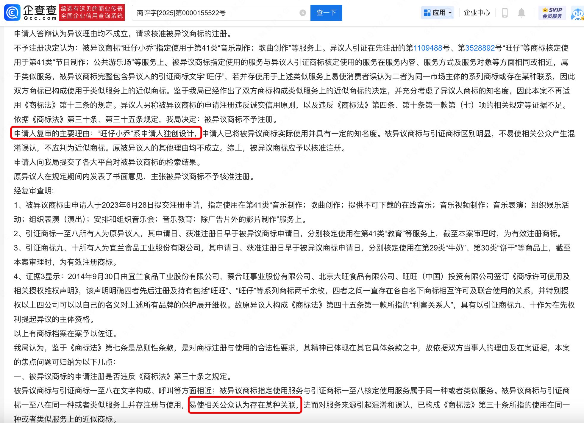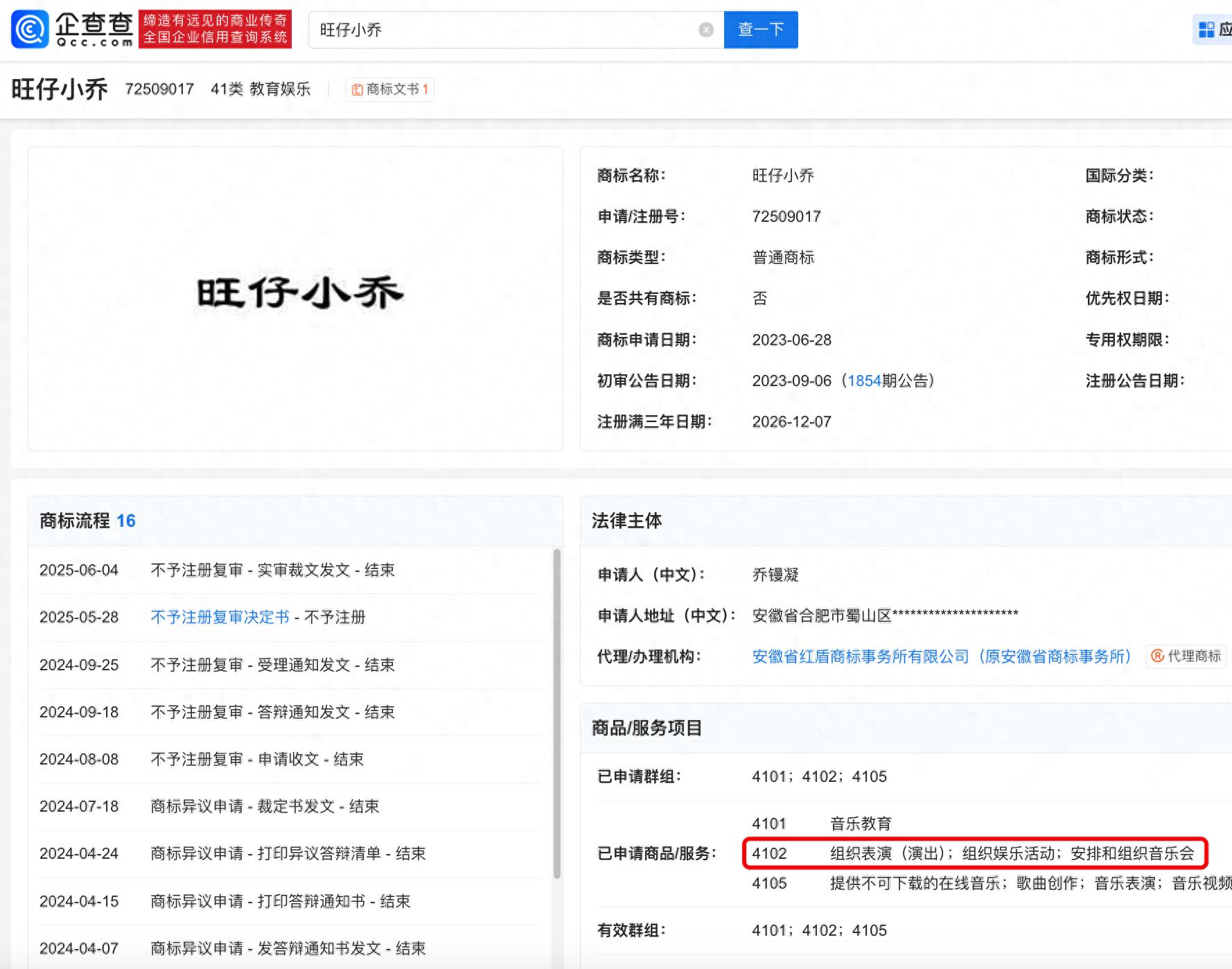 据企查查信息显示,乔某曾申请注册3枚“旺仔小乔”商标,国际分类涉及广告销售、教育娱乐等。其中后者类别商标服务包括组织表演(演出);组织娱乐活动;安排和组织音乐会等。值得注意的是,近期上述商标公布不予注册复审决定书,异议人为旺仔品牌相关公司。内容显示,异议人称该商标与“旺仔”商标构成相同或类似服务上的近似商标,申请人乔某称系独创设计,并具有一定的知名度。最终商标局认为“旺仔小乔”商标易使相关公众认为存在某种关联等,不予核准注册。
