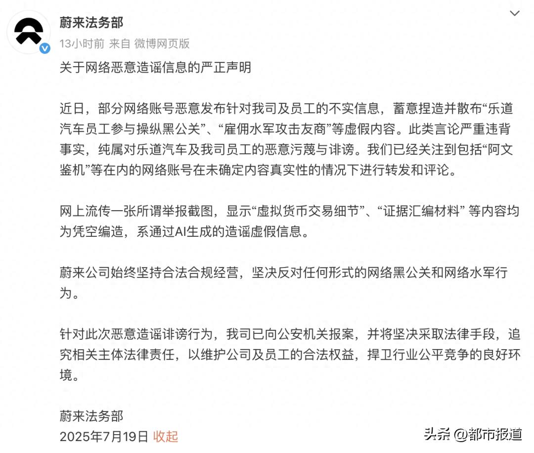 7月19日,@蔚来法务部发布关于网络恶意造谣信息的严正声明: