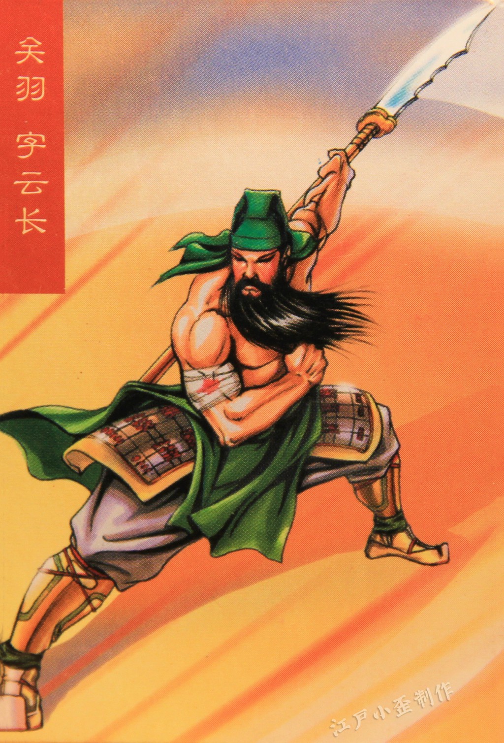 关羽满身戎装大马金刀坐着,那架势是陆树铭本人无疑。传说关二爷手不释卷,永远读着一本《春秋》,可惜只读一本春秋是不够的,吕蒙只学习一个星期,智谋就超过他了。没错,卡片背面吕蒙智谋力是3000,比关羽2700更高。
