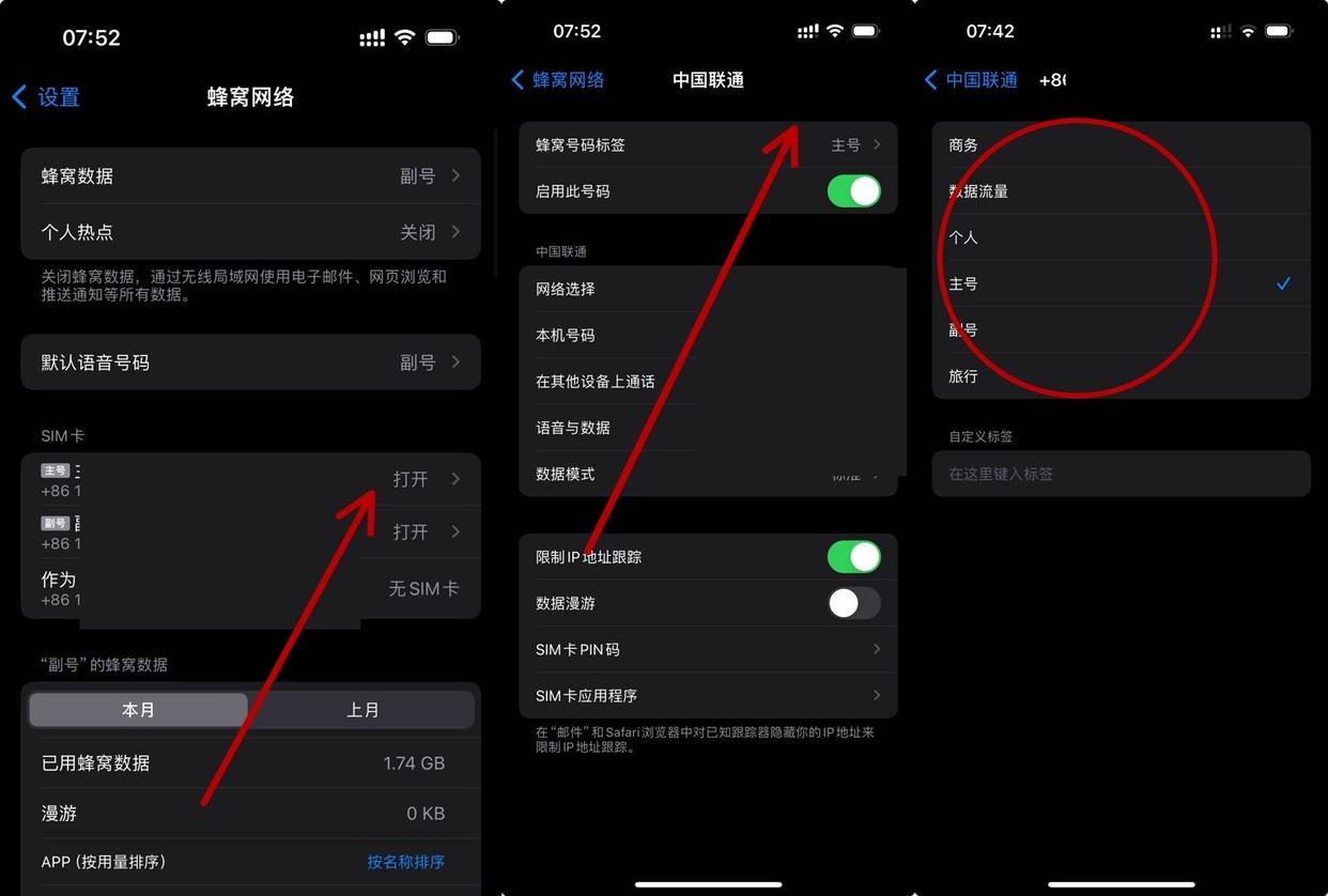 打开手机的“设置”应用,向下滑动找到“蜂窝网络”选项,点击进入。在这里,您会看到“SIM卡”选项,再次点击进入。此时,页面最上方会显示您当前的两张蜂窝号码标签。若要更改主副卡设置,只需点击对应的蜂窝号码,然后选择“蜂窝号码标签”进行更改即可。一张卡被设置为主卡后,另一张卡会自动被设置为副卡。
