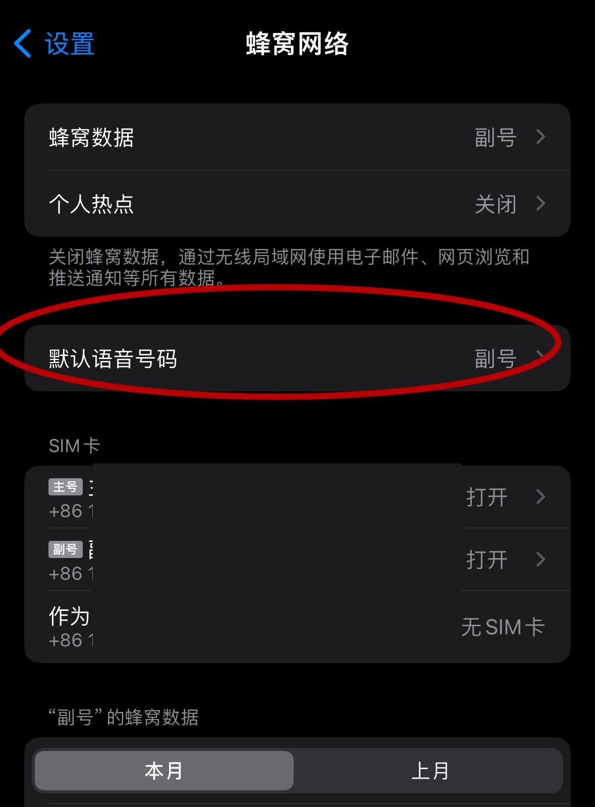 在“蜂窝网络”选项卡中,您还可以设置默认语音号码。这意味着,当您拨打新电话时,系统会默认选择此号码进行拨号。