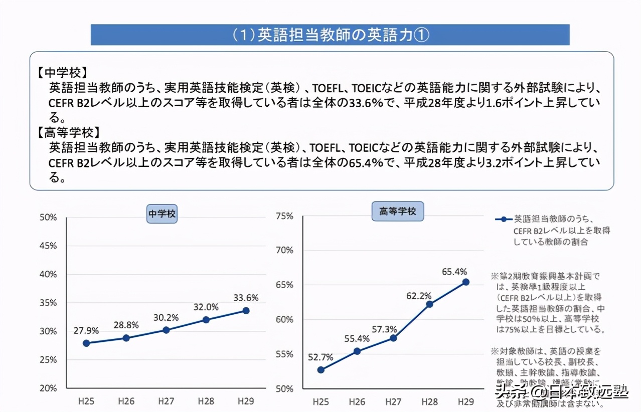 调查显示,日本的英语教师中只有36.2%的初中老师和68.4%的高中老师拥有CEFRB2水平的资格证明。出处:文部科学省(2019)「平成30年度英語教育実施状況調査の結果について」