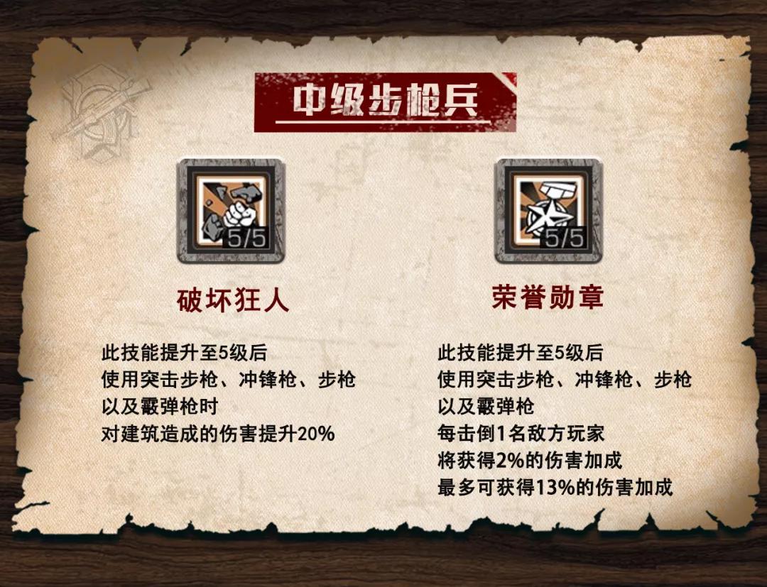 中级步枪兵:破坏狂人技能增加对建筑造成的伤害,在夏尔镇争霸赛中可以发挥大用处,荣誉勋章技能叠满之后伤害加成对所有武器都生效,是提升伤害的好方法。