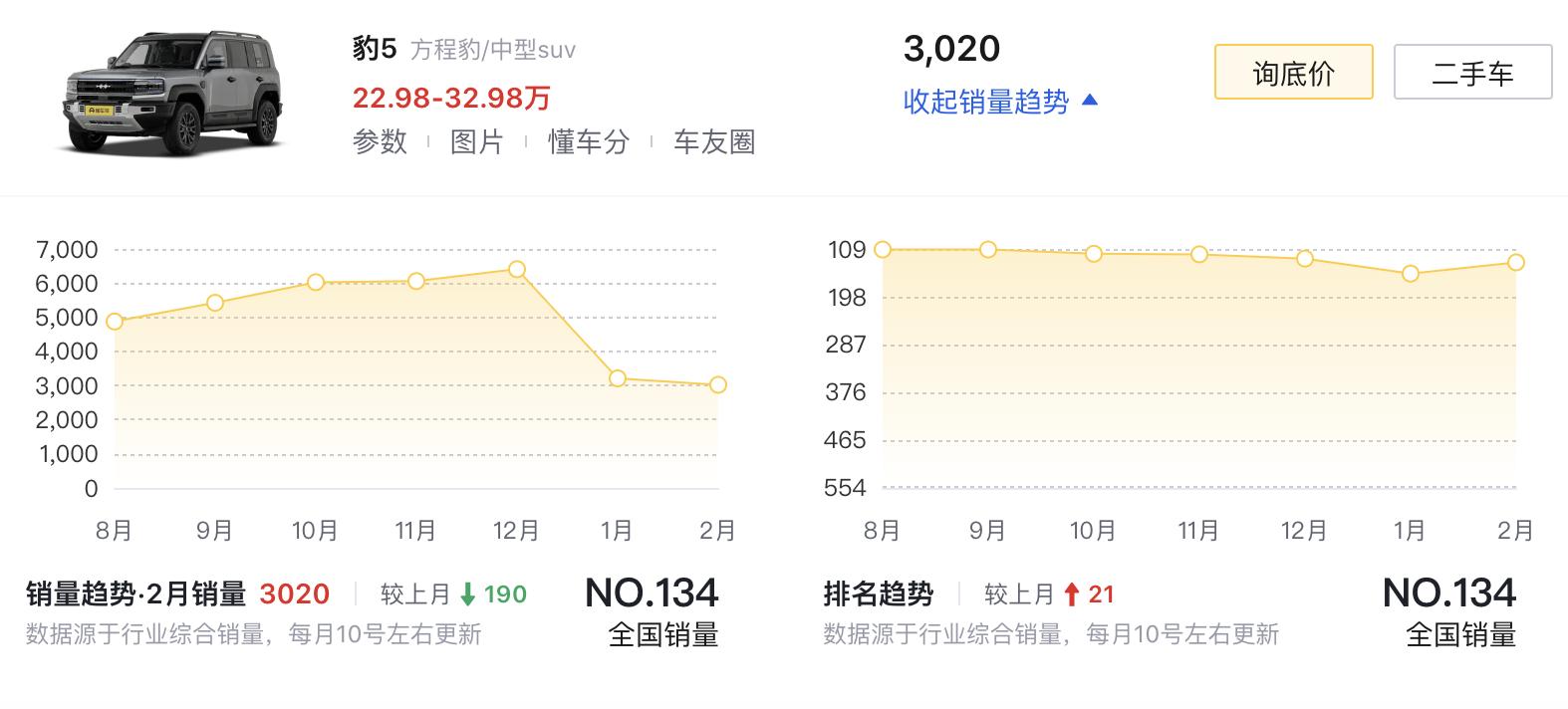 除此之外,目前搭载插电混动系统的硬派取向SUV还可选择方程豹豹5(指导价23.98万-32.98万元)、坦克400 Hi4-T(指导价28.58万-28.98万元)等车型。参考最新销量数据,坦克300燃油版今年2月销量为3889辆,北京BJ40今年2月销量为1401辆,方程豹豹5今年2月销量为3020辆。有关北京汽车的更多消息,我们将保持关注。