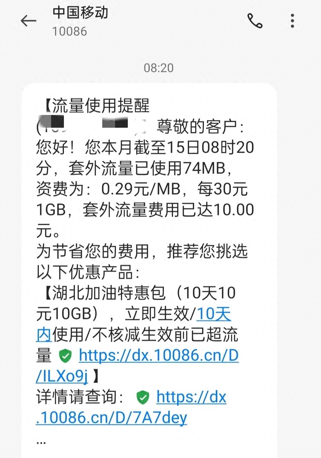前天上午移动发短信给我,说我套餐外的流量已使用74MB,按资费0.29/MB,我套外流量费用已达10元。