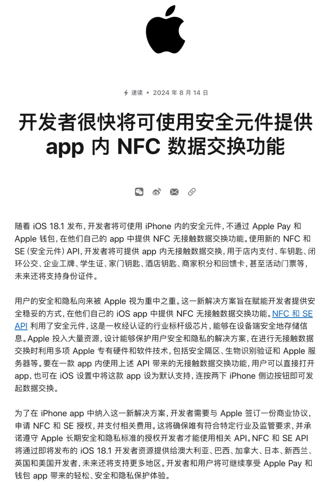 不过!苹果在今天发布了新闻稿,宣布即将开启 NFC 数据功能,允许开发者使用新的 NFC 和 SE(安全元件)API,开发者将可提供 app 内无接触数据交换。