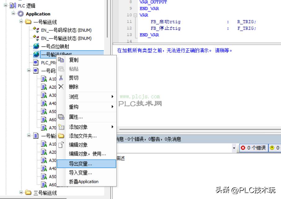 在编写 PLC 程序的时候,有时候会先写 PLC 程序,然后再去做触摸屏页面。PLC 里的变量特别多,如果一个一个手动输入到 HMI 当中,会耗费大量的时间,并且效率也很低。下面是导入步骤的分享: 选中想要导出的变量——右键点击——导出变量。