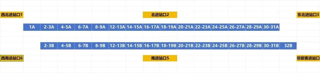 郑州东站候车厅内的检票口自西向东编号由1至32,其中,靠北的检票口为A;靠南的检票口为B。