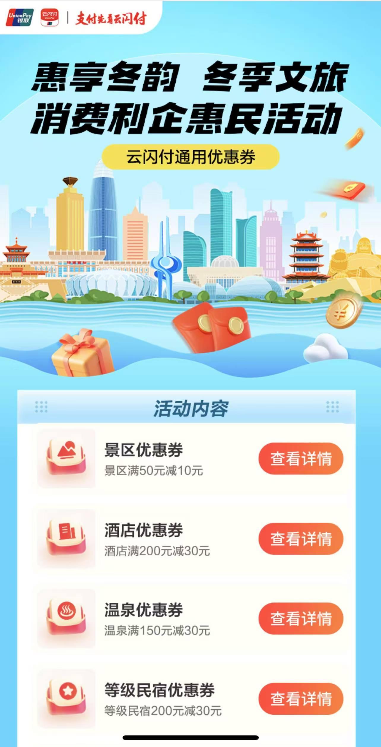 文旅活动内容及力度:景区满50元减10元优惠券、酒店满200元减30元优惠券、温泉满150元减30元优惠券、民宿满200元减30元优惠券、旅行社满1000元减30元优惠券。