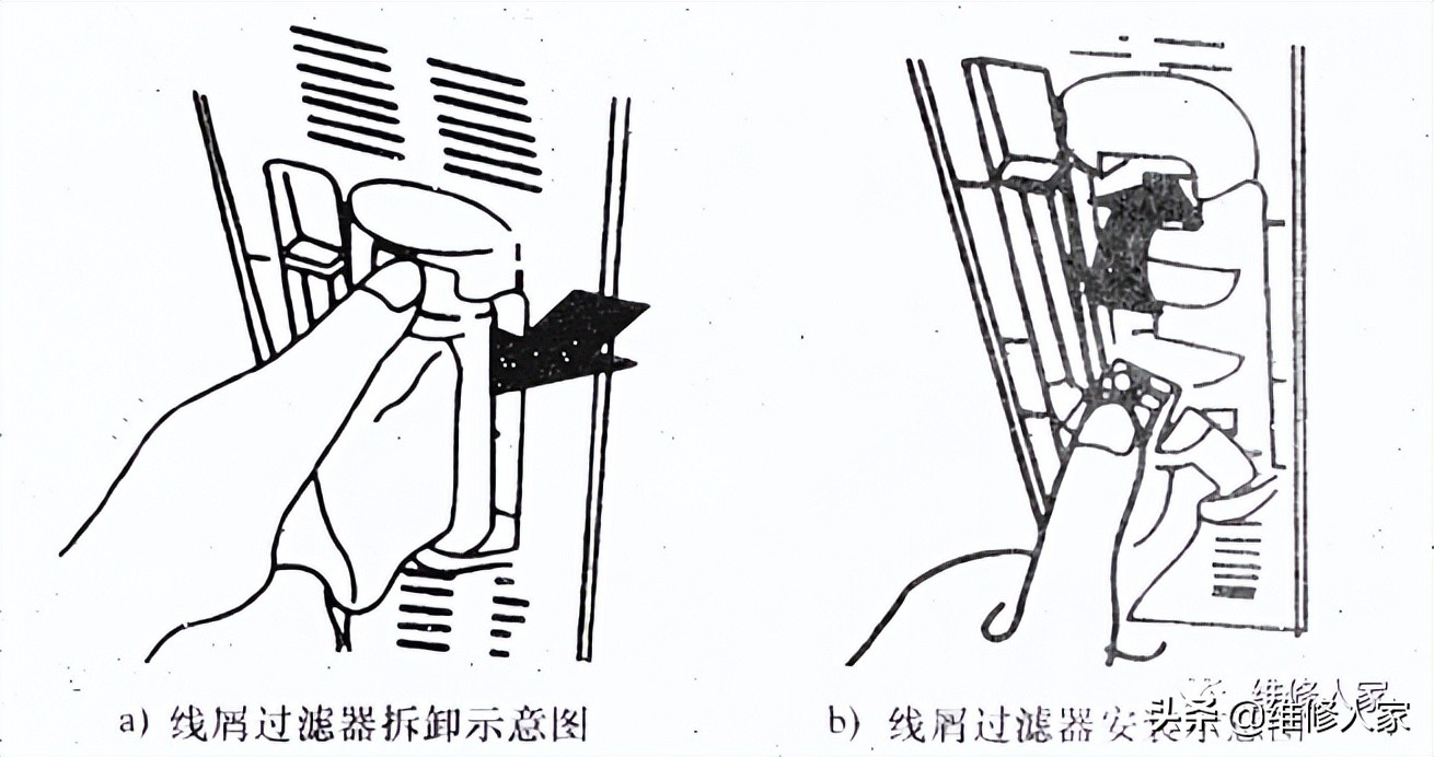 如下图所示,取下线屑过滤器时,将手放到相应的位置往下按,最后将其取下。安装时,将线屑过滤器底部插人溢水过滤器,再压人其上部即可。