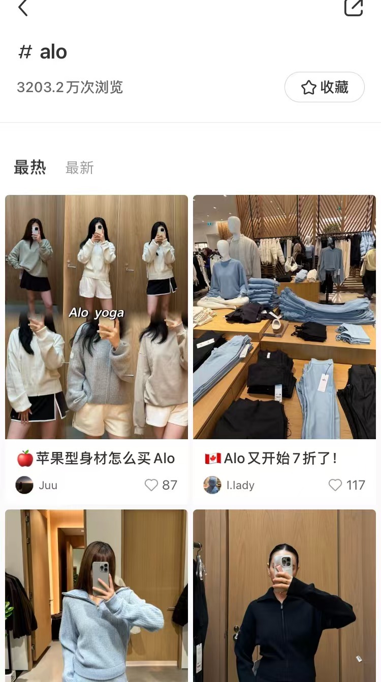 目前,Alo Yoga仅通过全球官网向中国市场销售,尚未入驻中文社交平台或开设官方销售渠道,但该品牌在中国并非完全没有知名度。社交平台上,已有不少海外消费者和代购发布了Alo Yoga的产品测评和新品动态,也有国内消费者分享从官网购买Alo Yoga的海淘经验。小红书上带有“alo”标签的内容已获3000多万次浏览。