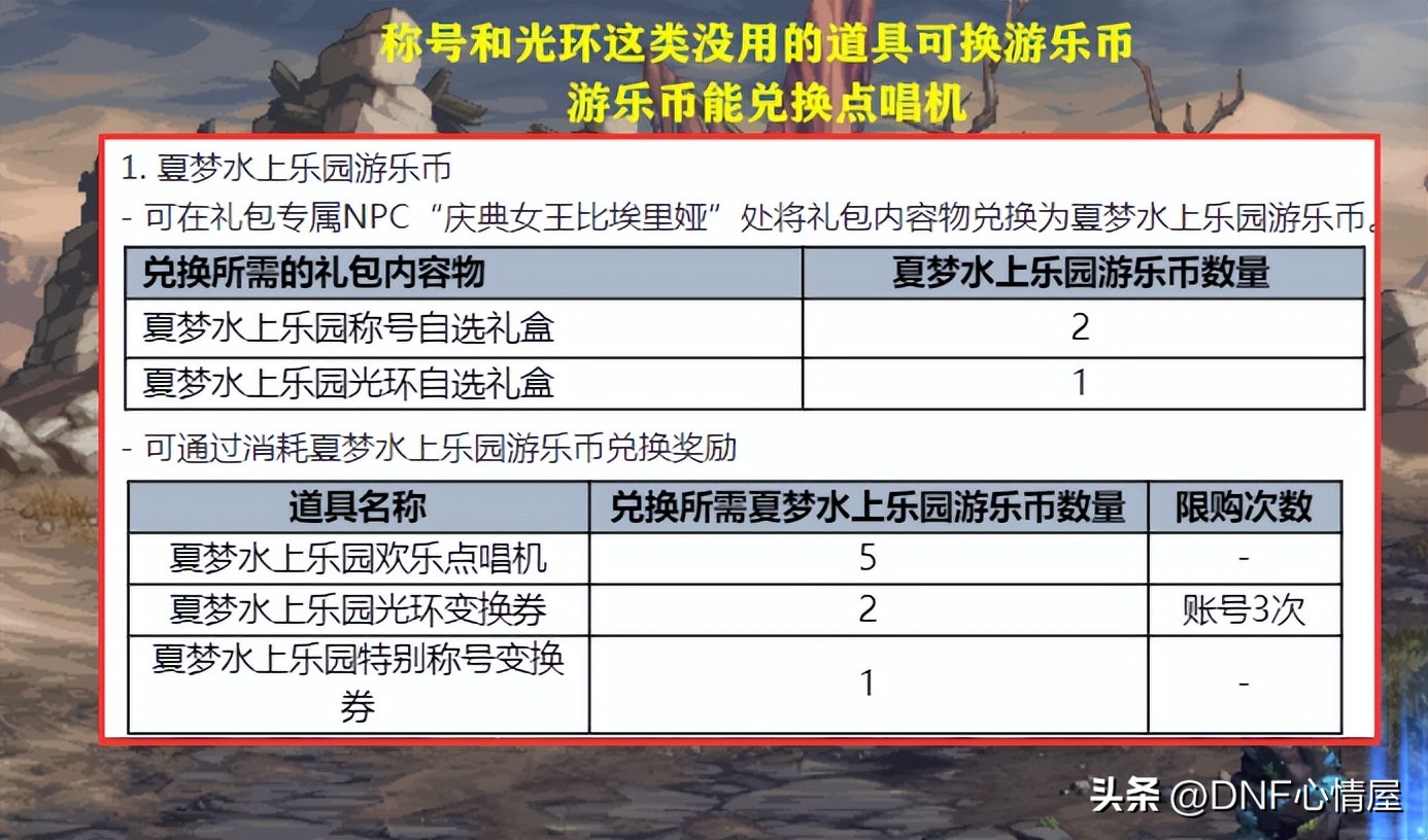 而“欢乐点唱机”,需5个夏梦水上乐园游乐币兑换,没有兑换次数。但夏梦水上乐园游乐币,得牺牲称号和光环礼盒,才可以获取。1个称号礼盒,换取2个游乐币,1个光环礼盒,换取1个游乐币。