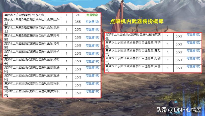 一套夏日礼包,只给1个称号和光环礼盒,全换成游乐币,才给3个,也就是说,无法换取“欢乐点唱机”。“欢乐点唱机”中,给的各系职业武器装扮,设定的概率非常低,只有0.5%的碰瓷机会。