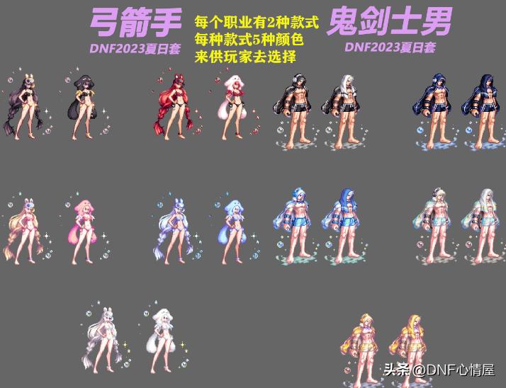 23年夏日套外观,已经提前爆料,“夏梦水上乐园”为主题,每个职业有2种款式,每种款式5种颜色,来供玩家去选择。
