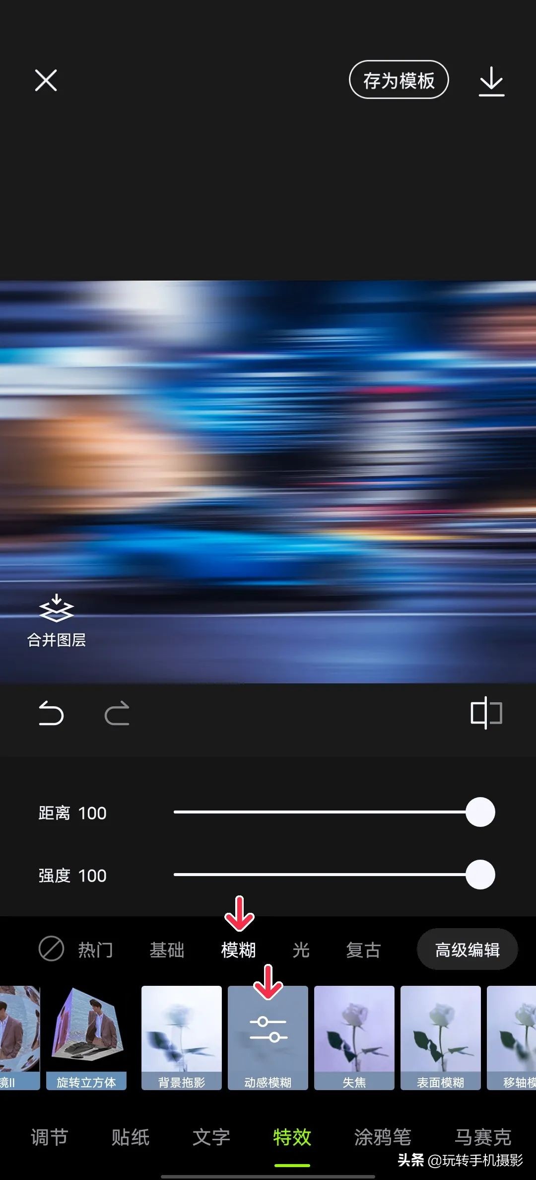 同样我们再点击「高级编辑」,添加「动感模糊」特效,距离和强度拉至100;根据相同操作,增加3~4个动感模糊就完成了。