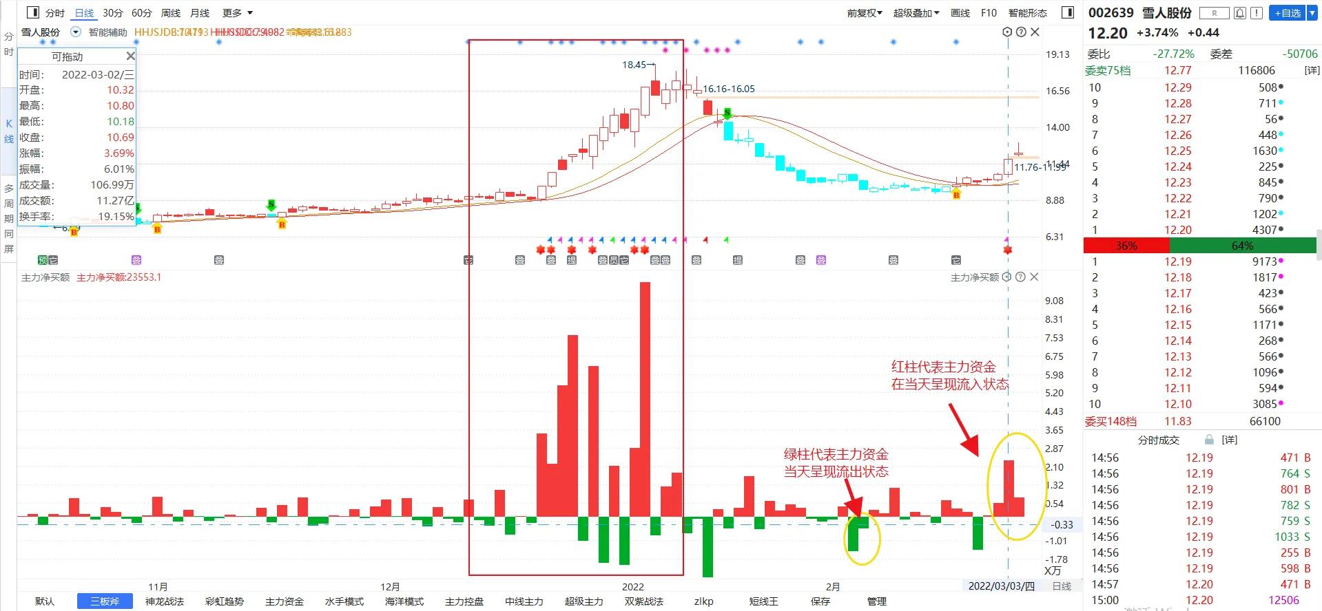 雪人股份目前所处的位置还是在上升趋势中,底部的时候主力净买额出现红色柱子,说明主力资金进场,这个是用来判断是否在底部启动的!