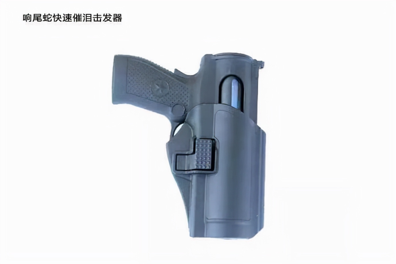 这是一套全新的组合装备,一个快速催泪击发器、一个新标横喷催泪器加上一个快速切换快拔套,组装搭配就成了一款新装备——响尾蛇快速催泪击发器。响尾蛇快速催泪击发器主体本身不能单独使用,需配合新标横喷催泪器使用。