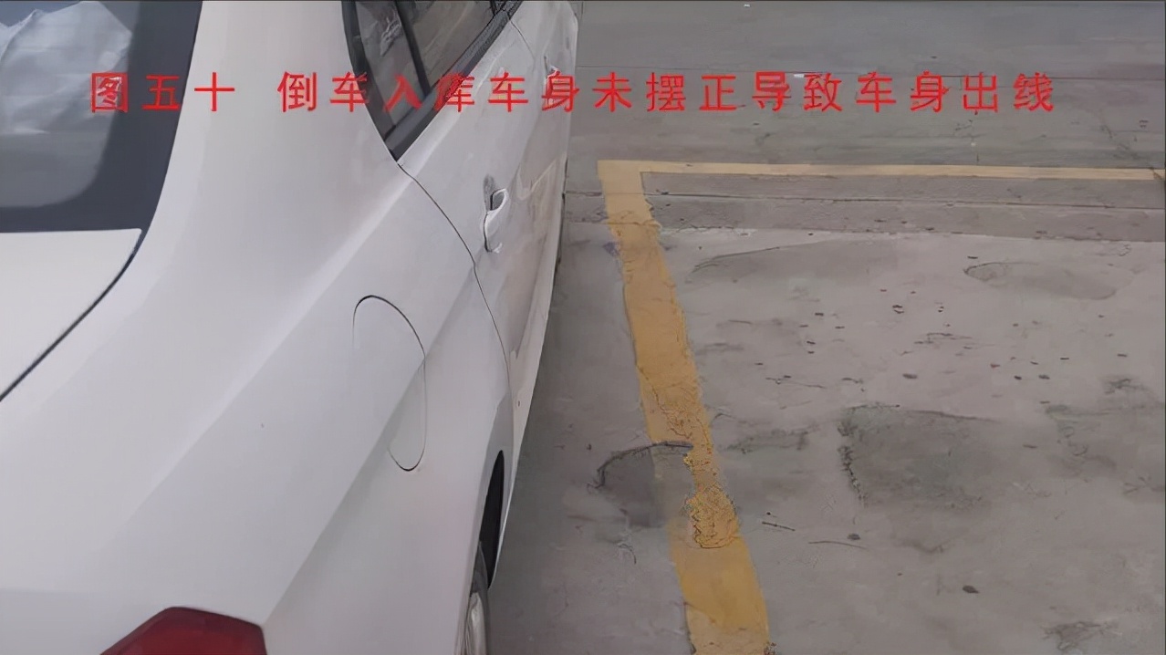 如图五十所示:入库停车后车身未摆正,是斜着入库的,此时并未碰线仍然是合格的;由于出库时缺少对车歪车正的判断,若未修正方向直接出库的话,车头或前轮是非常容易轧线的,同样会导致“车身出线”!