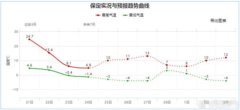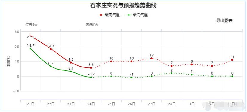 其他地区则出现下降,降幅在1~3℃左右。8时,南部的气温多在2℃左右,中北部地区多在冰点以下,在-3~~8℃左右,其中,坝上地区更低,多在-10℃左右。