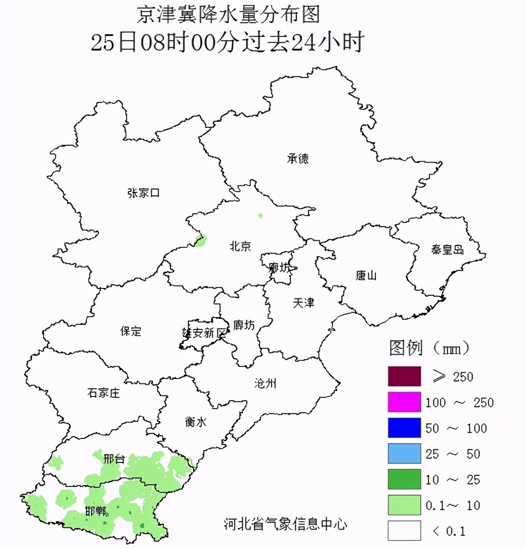 这次的降水量有多大?河北省气象台25日8时发布天气实况:24日8时~25日8时,承德北部、邢台、邯郸出现雨雪天气,降水区平均降水量为12.4毫米,邯郸的大名降水量最大为23.5毫米。
