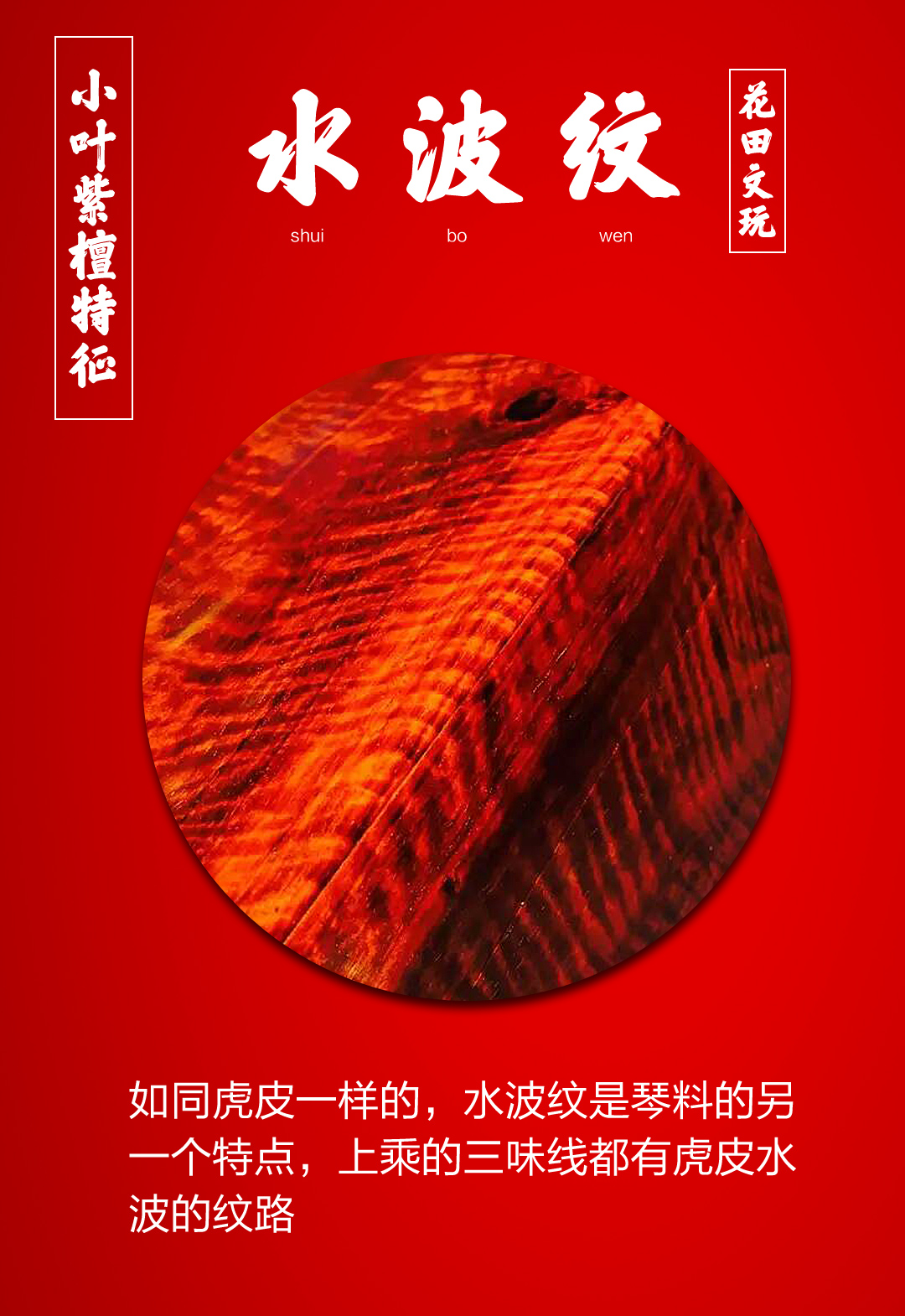我给大家的建议是看上面我说到的三个物理特征:水波纹、S形牛毛纹、火焰纹。大家在挑选的时候至少保证琴料具备三个特征之中的二个。再看料子的表面,是否油润,真正琴料的紫檀油性都非常好,通过这几步,基本能排除掉市面上大部门假料。