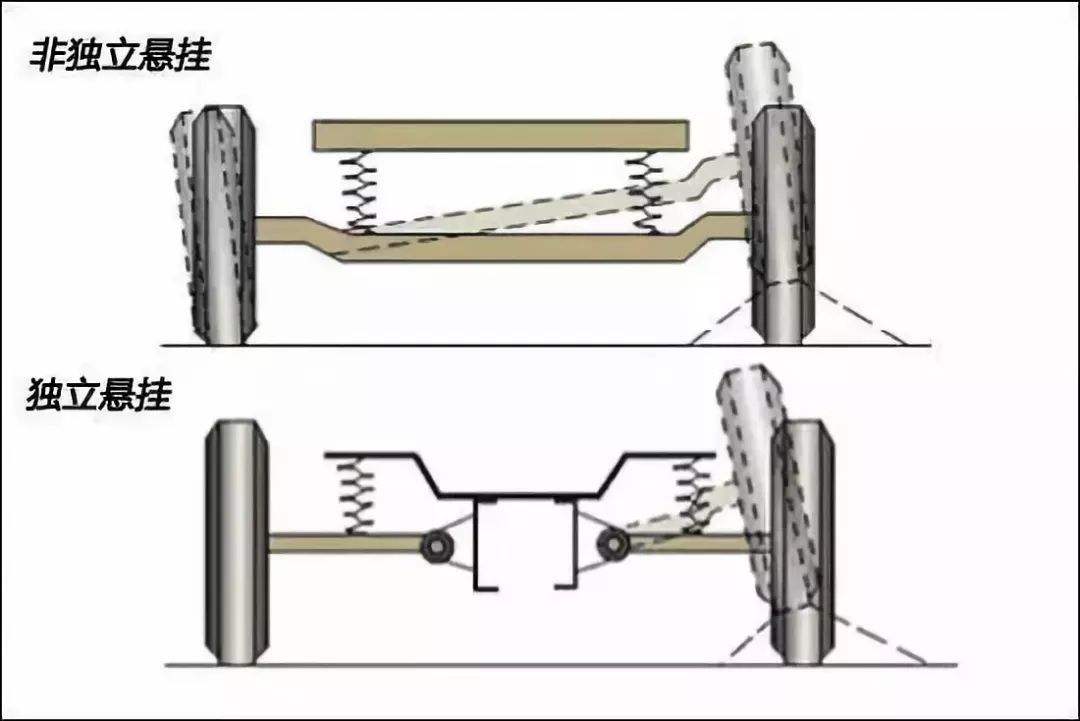 独立悬架系统的导向机构,是由多个独立运动的连杆组成的。这些连杆之间特殊的几何关系,让车轮在跳动时,是垂直上下运动,车轮始终垂直于地面,保证车轮与地面之间最大的接触面积;同时允许车轮跳动的行程更大,使车轮始终与地面接触,保证车轮与地面之间的附着力。此外,一侧车轮的运动不会影响另一侧车轮,既保证了舒适性,也保证了车轮附着力。