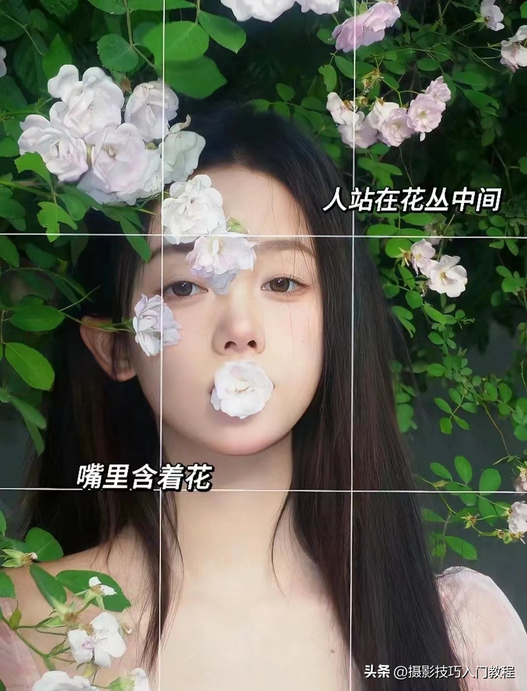 人像尽量躲进花丛中,可以将周围的一个花枝拉到自己的胸前,作为前景,丰富画面层次的同时,也能遮挡一些小肚腩,弱化身材缺陷。