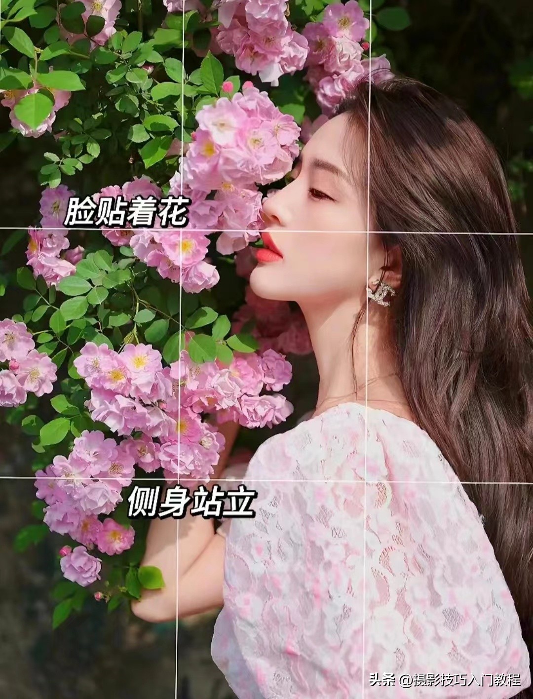 拍近景特写,人像脸部紧贴着花,侧脸展现在镜头前,头稍微抬一起,下巴线条才会更加流畅。