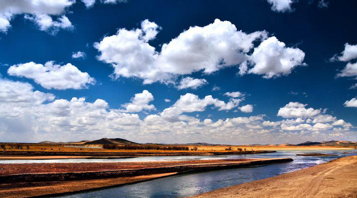 而应当依据三分法,放在画面上、下三分之一处,可以根据实际情况选择突出天空云团或地面景物。